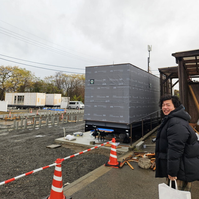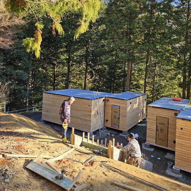9棟の宿泊棟が設置されこれから内外装工事、施設全体もインフラの2次工事、外構工事など慌ただしく2026年を迎えます(滋賀県)