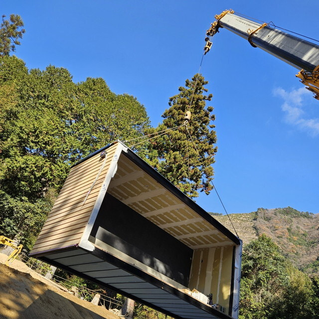 2024年6月13日―7月開業のB社様グランピングリゾート施設。本日から宿泊棟、管理棟のコンテナキャビンの現地搬入が始まりました。クレーン車を使って木々の間をぬって配置する風景はまさに職人芸です。さぁ、これから本格的に施設の姿が浮かび上がってきます【岐阜県】